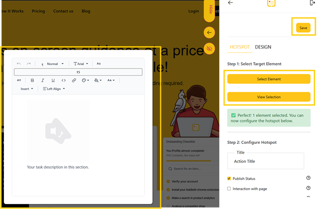The Hotspot is a subtle, highlighted area designed to visually draw the user's attention to a specific element on the webpage. This action serves as a non-intrusive indicator to focus the user's eye on a critical area.
