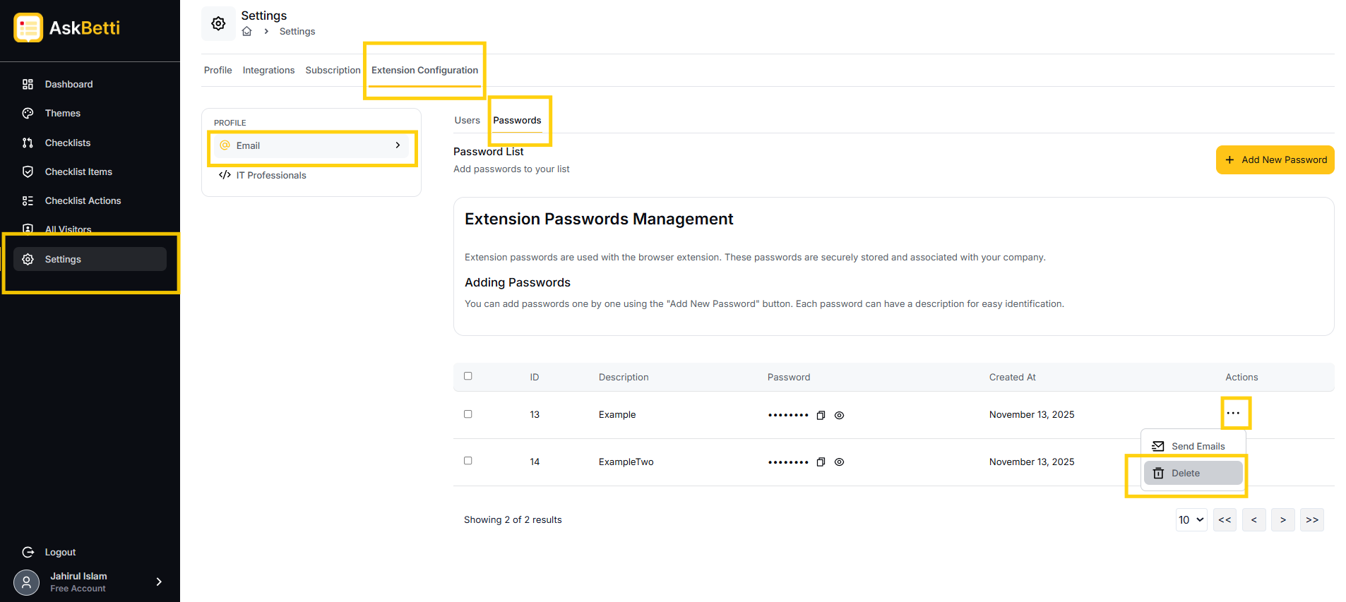 - Click on the three-dots icon (...) in the Actions column for the password you want to delete.
