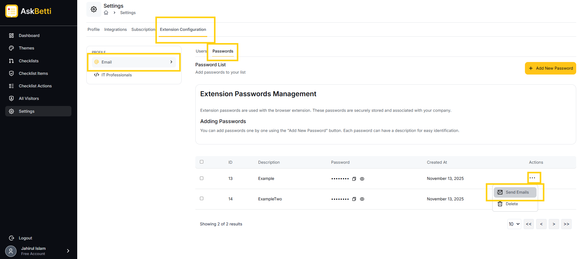 - Click on the three-dot icon (...) in the Actions column for the password you want to email or delete.