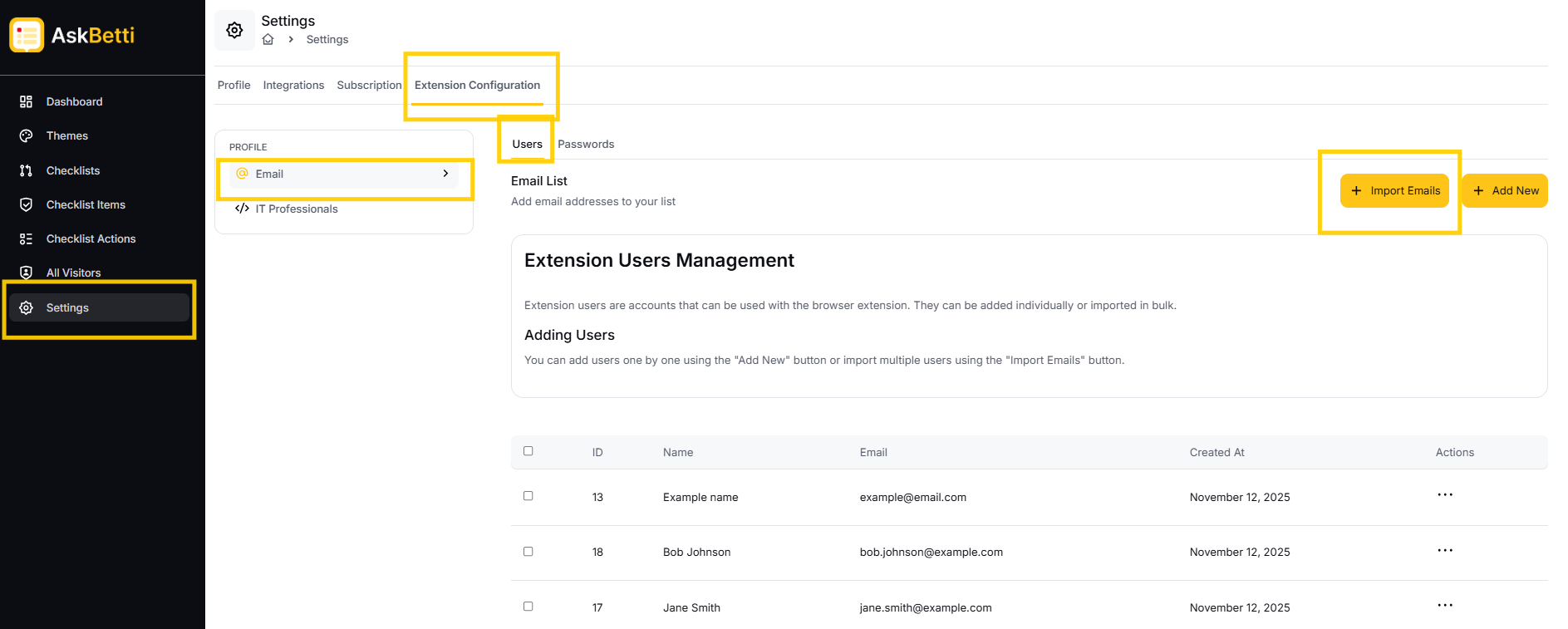 Extension users are accounts that can be used with the browser extension. They can be added individually or imported in bulk.