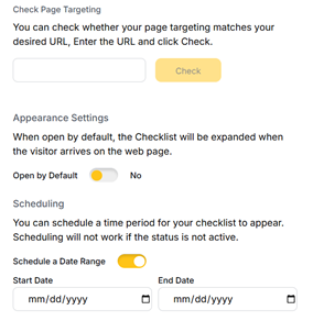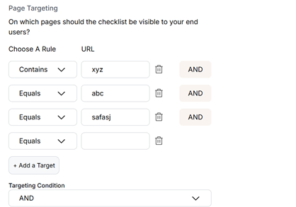 - Page Targeting: This feature lets you control which pages your checklist appears on. Use AND/OR rules to set specific conditions for the URLs. For example, you can show a checklist only on pages that contain "product" AND "feature".’