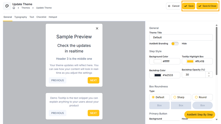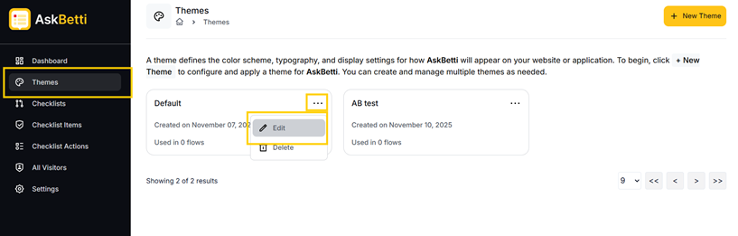 Themes in AskBetti define the look and feel of your onboarding content. A theme is a set of colors, typography, and display features that determine how your checklists, tooltips, and other elements will appear on your website.
