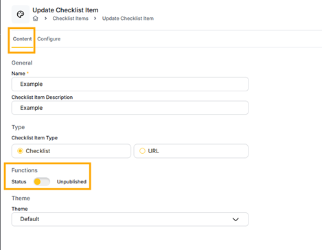 - You can publish a Checklist item by clicking on the three dots in the top right corner of the item name.