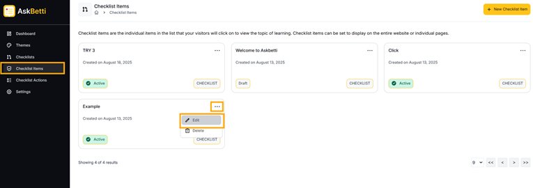 - Go to the Checklist Items section in the main menu. Here you will see a list of your existing checklist items.