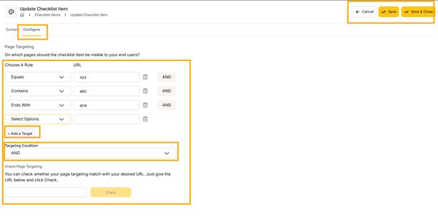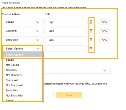 Page Targeting: This feature lets you control which pages your checklist appears on. Use AND/OR rules to set specific conditions for the URLs. For example, you can show a checklist only on pages that contain "product" AND "feature".’