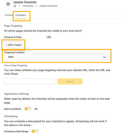 Page Targeting: This feature lets you control which pages your checklist appears on. Use AND/OR rules to set specific conditions for the URLs. For example, you can show a checklist only on pages that contain "product" AND "feature".
