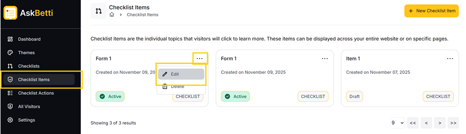 - Go to the Checklist Items section in the main menu. Here you will see a list of your existing checklist items.
